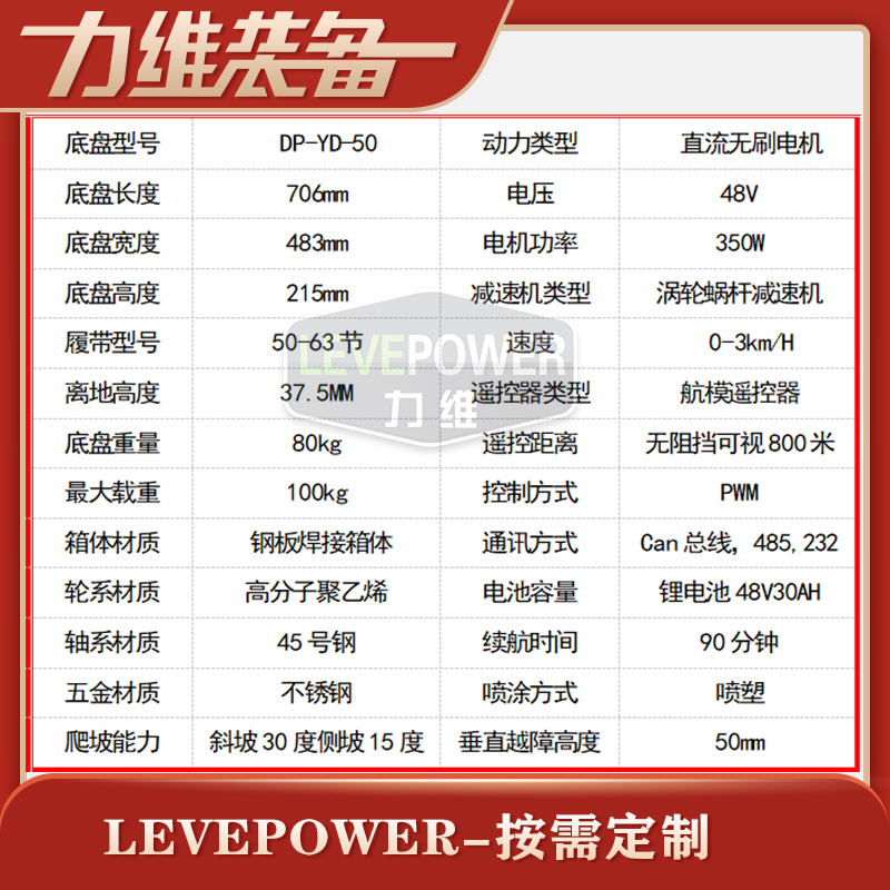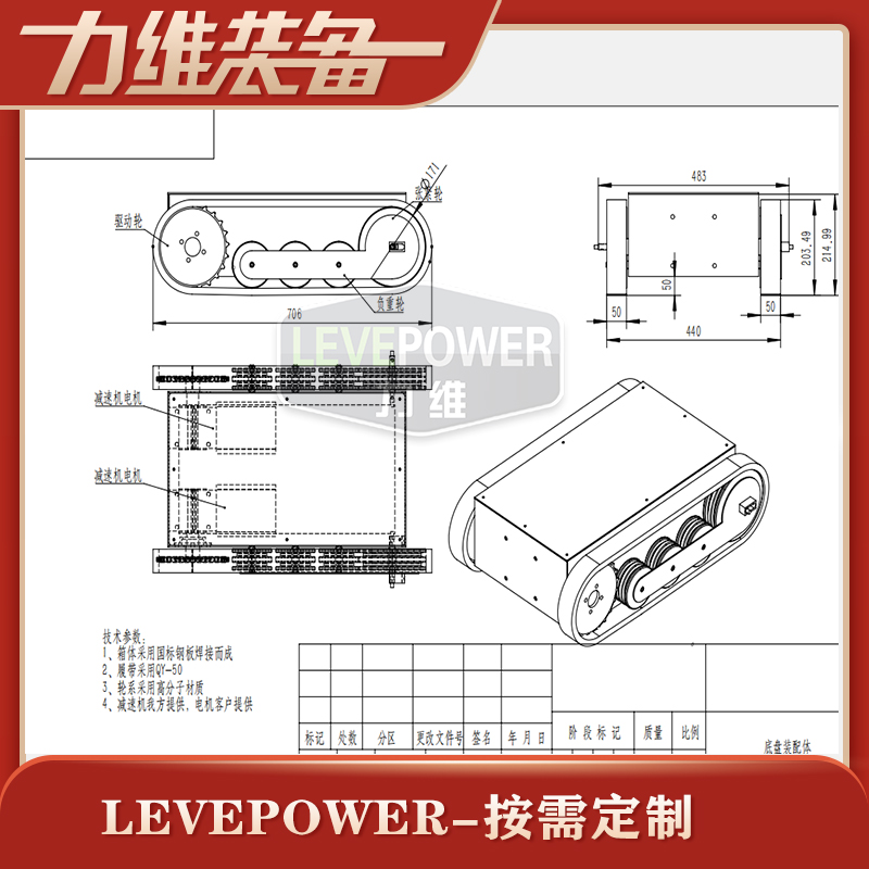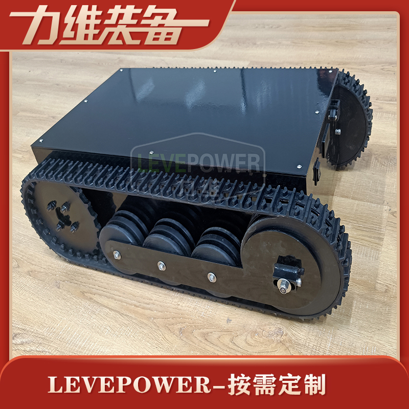 橡膠履帶底盤長706mm,橡膠履帶底盤寬483mm,橡膠履帶底盤高215mm,無線航模遙控履帶底盤采用48v350W直流無刷電機,渦輪蝸桿減速機,轉彎靈活,操控簡單。履帶底盤電池采用48V30AH鋰電池續航時間更長。履帶底盤箱體采用鋼板焊接而成,輪系采用高分子聚乙烯,履帶底盤整體重量輕,耐磨性強。