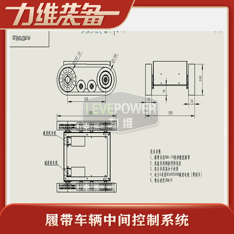 履帶底盤長668mm,履帶底盤寬550mm,履帶底盤高242mm,無線遙控履帶底盤箱體采用鋼板材質焊接而成,防腐性能好。履帶底盤動力采用48V500W直流無刷電機,渦輪蝸桿減速機動力更強,轉彎靈活。履帶底盤電池采用48V20AH鋰電池,續航時間更長,是一款不錯的機器人橡膠履帶。