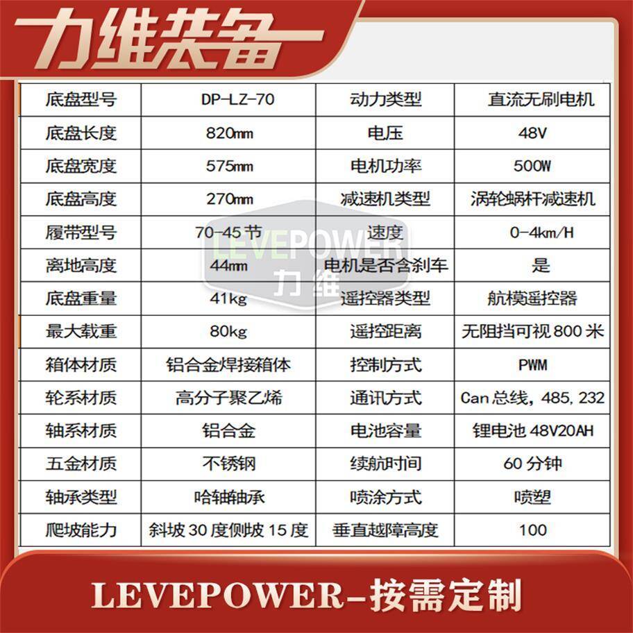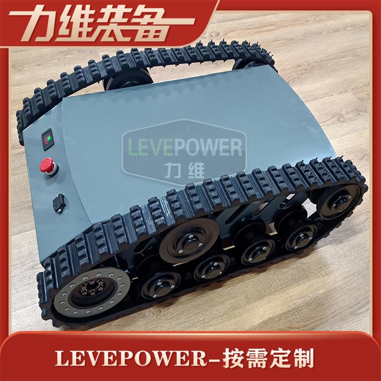 履帶采用70mm寬度八字紋耐磨橡膠履帶,外花紋較密集,行走狀態(tài)顛簸感較輕,內(nèi)置高強(qiáng)度抗拉伸纖維。輪系采用高分子聚乙烯材質(zhì),密度高,耐磨性好。底盤采用鋁合金箱體焊接,框架經(jīng)過高溫噴砂噴塑防銹處理,采用直流無刷電機(jī),雙驅(qū)控制器,航模遙控器,遙控距離可達(dá)500米。履帶行走系統(tǒng)結(jié)構(gòu)采用固定式結(jié)構(gòu),在泥濘狀態(tài)下使用更好的避免拖帶,此款履帶底盤可載重80kg,速度2km/H,該底盤穩(wěn)定性好。抓地力更強(qiáng),上裝可裝置清洗裝備,清污裝備,攝像頭等,適用于狹小的泥污環(huán)境作為清洗裝備或勘察裝備。