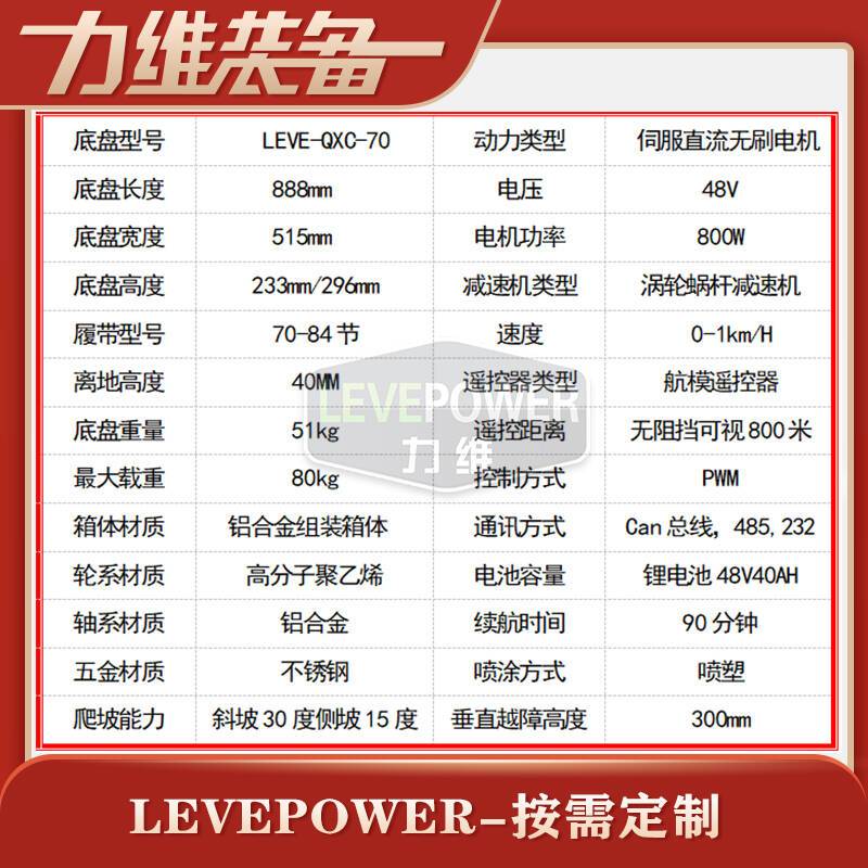履帶底盤長888mm,履帶底盤寬515mm,履帶底盤高296mm,PWM無線遙控履帶底盤通訊方式:Can總線,485,232.箱體采用鋁合金材質焊接而成,防腐性能好。履帶底盤動力采用48V800W直流無刷電機,渦輪蝸桿減速機動力更強,轉彎靈活。履帶底盤電池采用48V40AH鋰電池,續航時間更長,是一款不錯的機器人橡膠履帶。