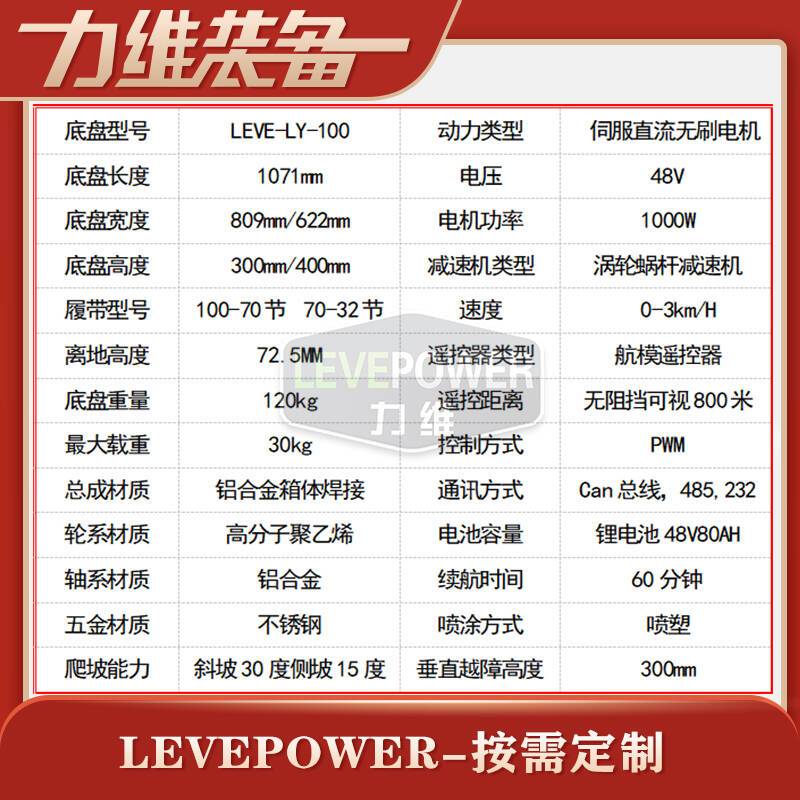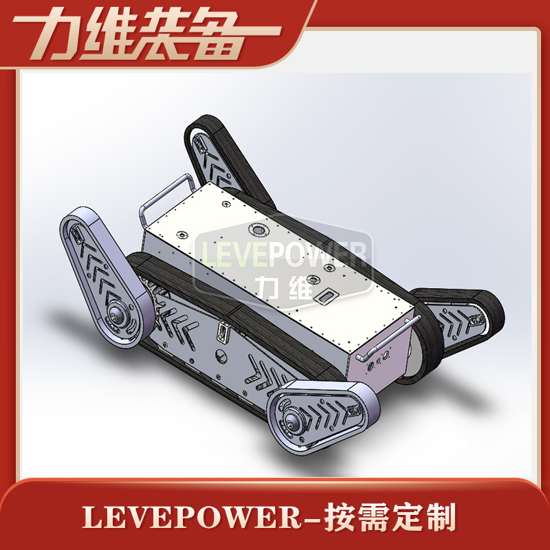 DP-LY-100主體履帶選擇100mm寬度履帶,擺臂履帶選擇70mm寬度履帶,橡膠履帶采用天然橡膠加凱夫拉纖維高溫硫化而成,輪子采用高分子聚乙烯材質(zhì),耐磨性能強(qiáng),橡膠履帶合理的橫紋設(shè)計,越野性能更強(qiáng),是一款不錯的履帶越野底盤。特種橡膠履帶底盤長1071mm,履帶底盤寬809mm,履帶底盤高300mm,無線遙履帶底盤搭載48V1KW直流無刷電機(jī),RV50渦輪蝸桿減速機(jī),動力更強(qiáng)。擺臂部分采用2個1kw的直流無刷電機(jī),履帶底盤采用48V80AH鋰電池,續(xù)航時間60分鐘。四驅(qū)履帶越野底盤,動力更強(qiáng)。爬樓履帶機(jī)器人底盤,前后擺臂設(shè)計,不僅外觀漂亮,越野性能更強(qiáng),爬樓性能更穩(wěn)定。履帶底盤框架采用鋁合金箱體焊接而成,底盤承載力大,是一款全地形履帶底盤.