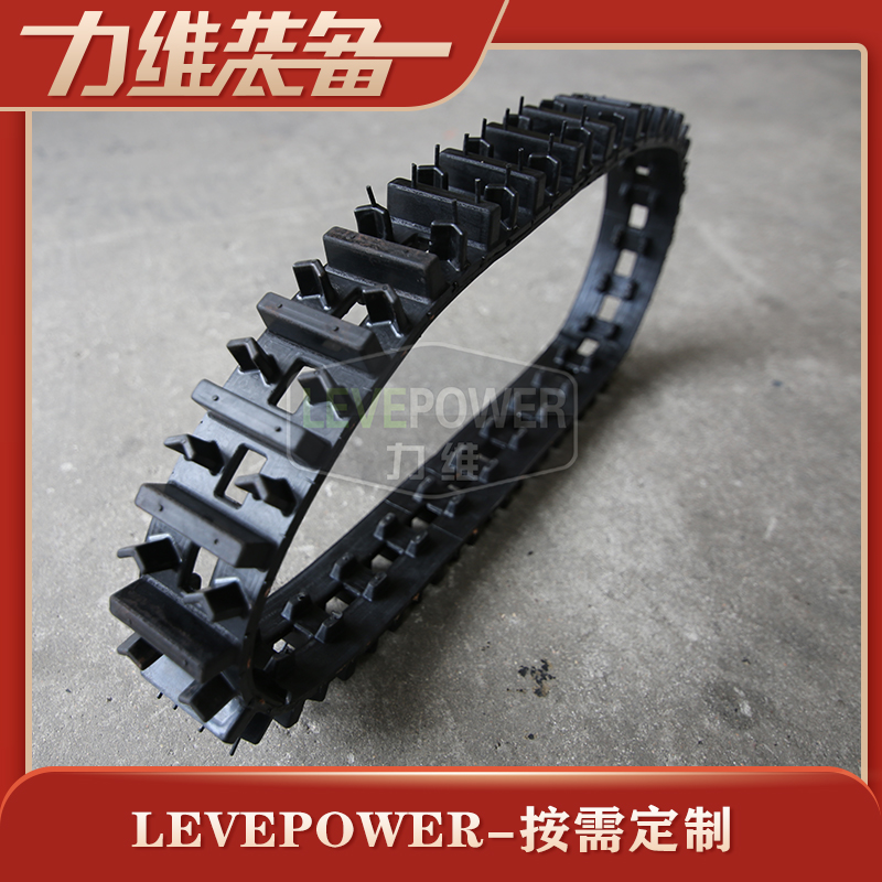 此履帶采用高耐磨橡膠,是一款耐磨橡膠履帶,內置凱夫拉纖維,輕巧,耐用,并且防滑效果好。可以在較窄的區域限制內使用,也可以在雪地,泥濘地里行走,內置激光件骨架,此產品用于不超過總載重200kg以內的機械裝備使用。