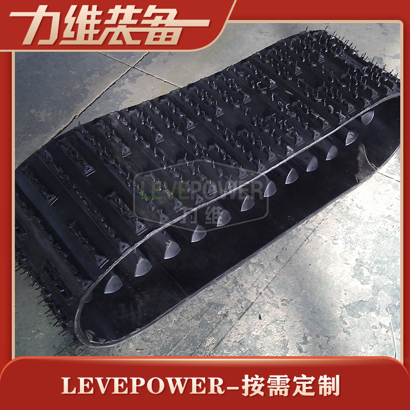 此款耐磨橡膠履帶外花紋采用不規則高花紋外形設計,內齒設計為高齒梯形,內置高強度鑄鋼件,此款抓地力較強,適合草地、雪地、柏油路多種地形。