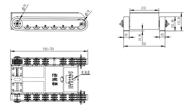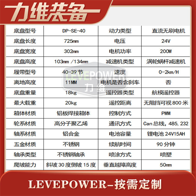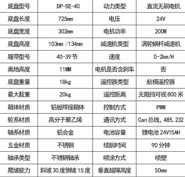橡膠履帶底盤長700mm左右,履帶底盤寬340mm左右,履帶底盤高110mm左右,整車采用6061鋁合金箱體焊接,材質輕,耐腐濁,履帶車搭載24v200W直流永磁無刷電機,渦輪蝸桿減速機,動力強,體積小,防水性能好,越野性能強,可用于管道清淤,偵查、巡檢等場景。