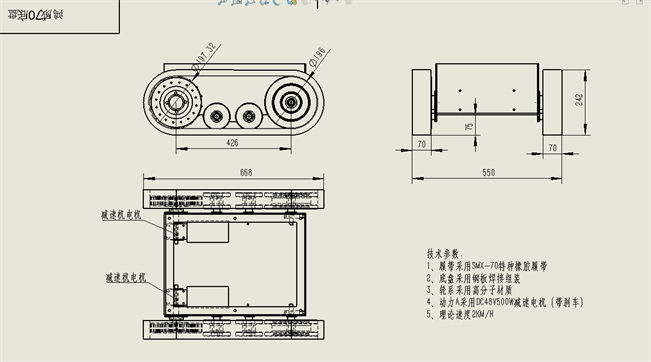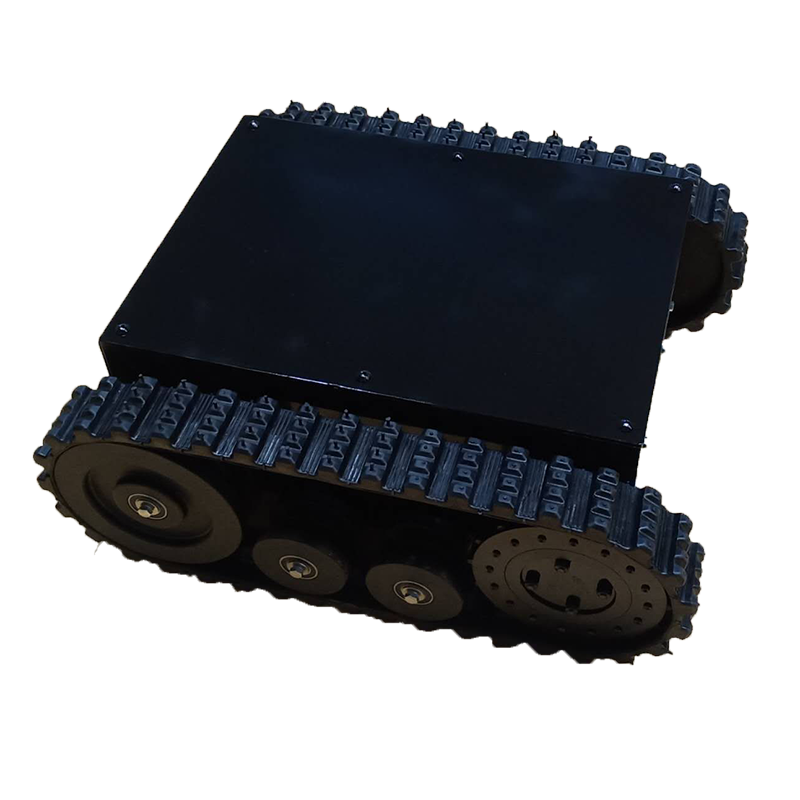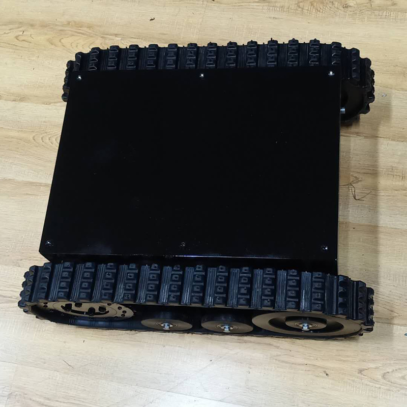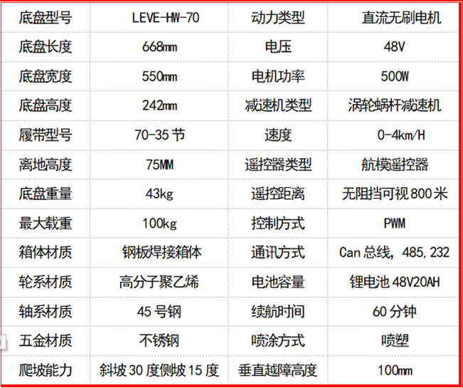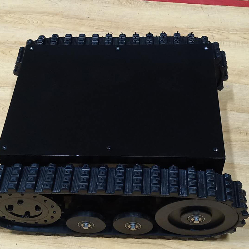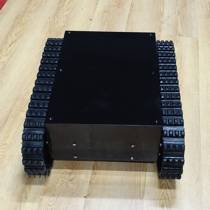 履帶底盤長668mm,履帶底盤寬550mm,履帶底盤高242mm,無線遙控履帶底盤箱體采用鋼板材質焊接而成,防腐性能好。履帶底盤動力采用48V500W直流無刷電機,渦輪蝸桿減速機動力更強,轉彎靈活。履帶底盤電池采用48V20AH鋰電池,續航時間更長,是一款不錯的機器人橡膠履帶。