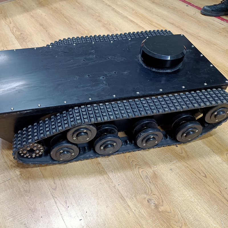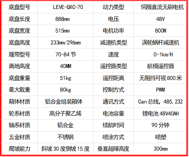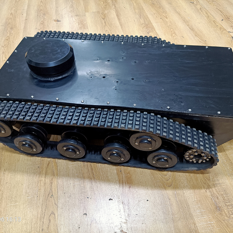 履帶底盤長888mm,履帶底盤寬515mm,履帶底盤高296mm,PWM無線遙控履帶底盤通訊方式:Can總線,485,232.箱體采用鋁合金材質焊接而成,防腐性能好。履帶底盤動力采用48V800W直流無刷電機,渦輪蝸桿減速機動力更強,轉彎靈活。履帶底盤電池采用48V40AH鋰電池,續航時間更長,是一款不錯的機器人橡膠履帶。